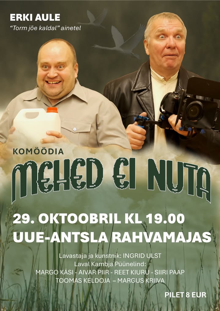 Uue-Antsla Rahvamaja Uue-Antsla, Antsla vald, Võrumaa, EestiOperaator Kaljo ja tema abiline Mati lähevad maakohta filmima Sulev Nõmmiku kultusfilmi "Mehed ei nuta” jaoks viimast kaadrit lahkuvast luigeparvest. See töö polegi aga nii lihtne, kui pealtpoolt paistab ja viib filmimehed vägagi omapärastesse sekeldustesse nii külaelanike kui ametnikega, kellel kõigil on oma huvid ja soovid, mis üksteisega põrkuvad. Ainsad, kes sekeldamisest kõrvale jäävad, on luiged … Lavastuse sõnum on: ära kaota eesmärki. Meil kõigil on oma eesmärgid – kellel suuremad ja kellel väiksemad. Elu on täis hetki, mis meid eesmärgist kõrvale kallutavad. Kui me märkame, et oleme sihi silmist kaotanud, peame tegelema tagajärgedega ning leidma uuesti eesmärgi. Vahel aga…