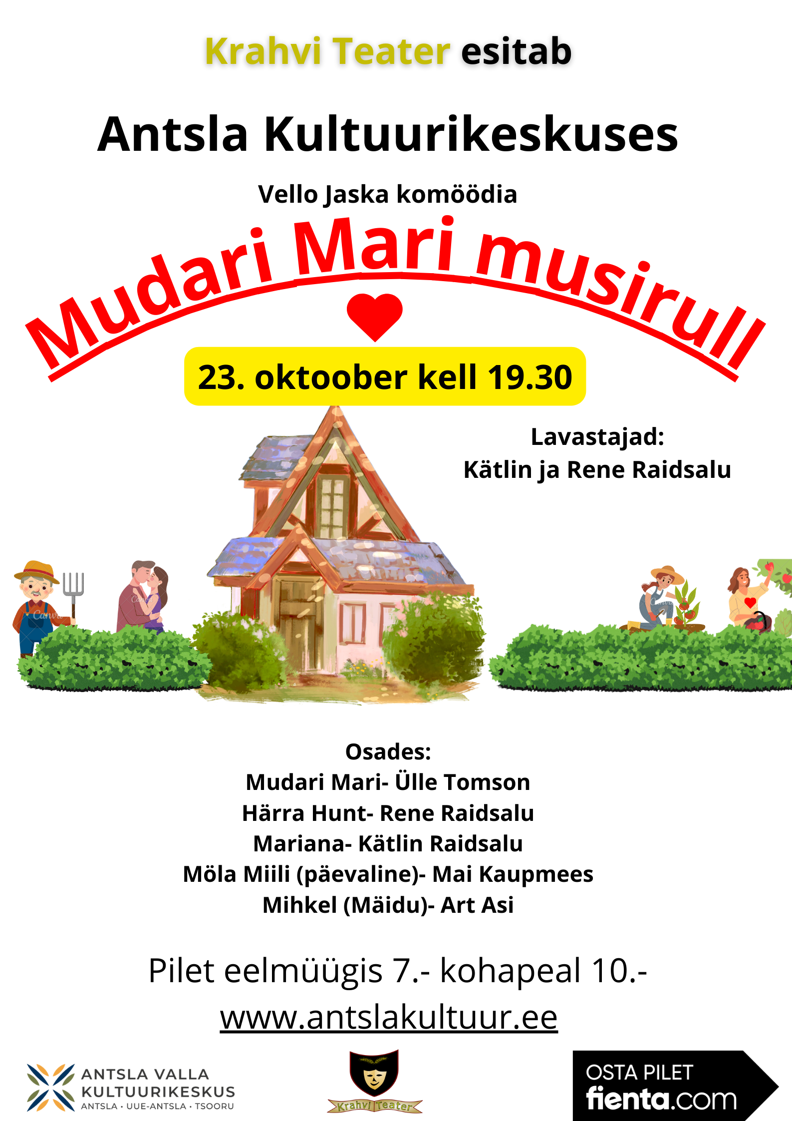 Antsla Kultuurikeskus Kooli tee 19, Antsla, Võrumaa, Eestipilet eelmüügis 7 eur/ kohapeal 10 eur https://fienta.com/et/krahvi-teater-mudari-mari-musirull