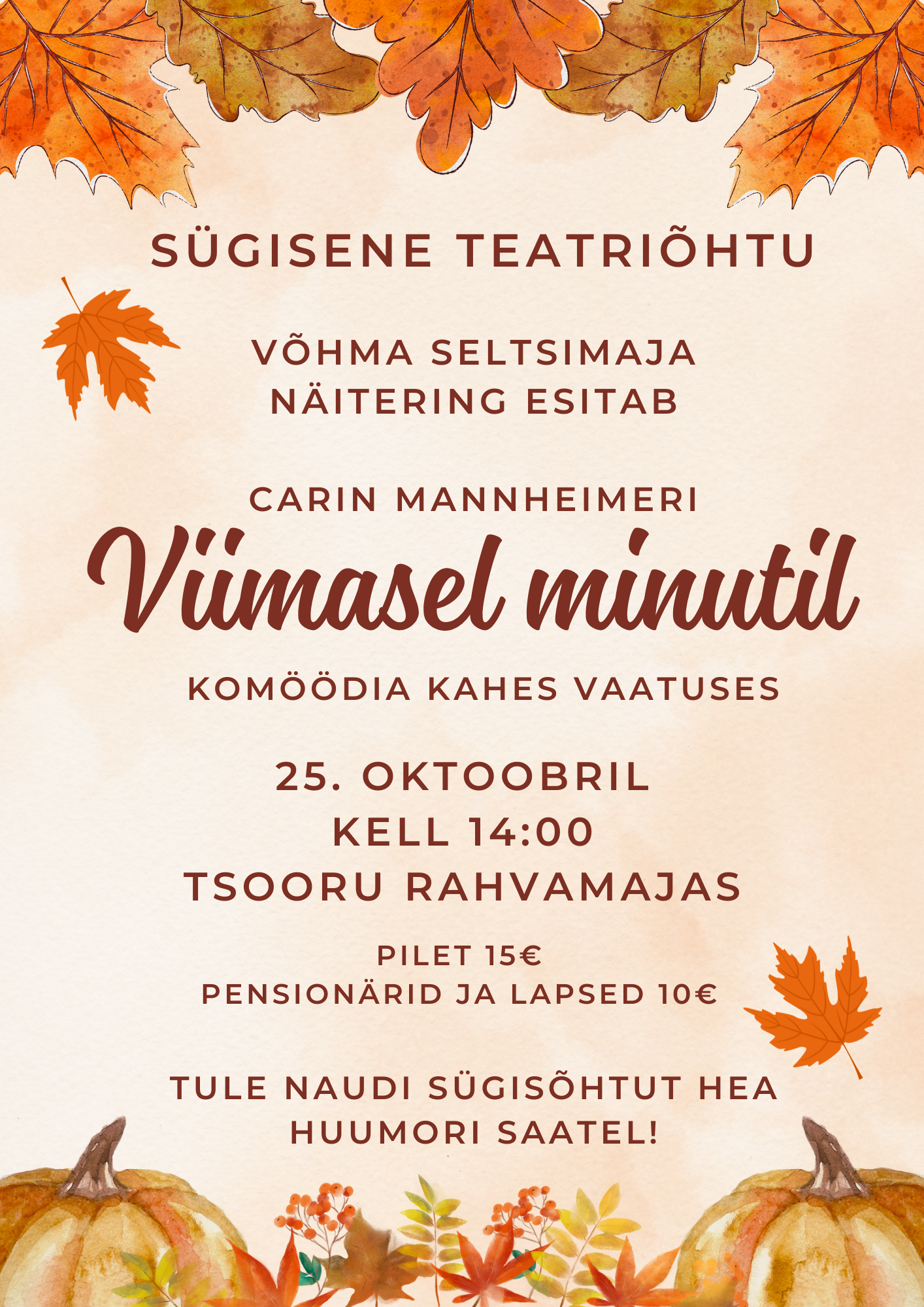 Tsooru Rahvamaja Tsooru, Antsla vald, Võrumaa, Eestipilet 15 eur sooduspilet 10 eur Carin Mannerheimi näidend Võhma Seltsimaja näiteringi esituses. Väärikas ja humoorikas vananemine on vajalik, teraapiline, julgustav teema, mis kõnetab neid, kes seda omal nahal kogenud, aga ka nooremaid, sest neil on vanemad. Komöödiavõtmes südamest naerma ajav tekstihuumor, karakterite uperpallid ja situatsioonikoomika iseloomustab lavastust, mis 2015.aastal Draamateatri repertuaaris publikumagnet oli.