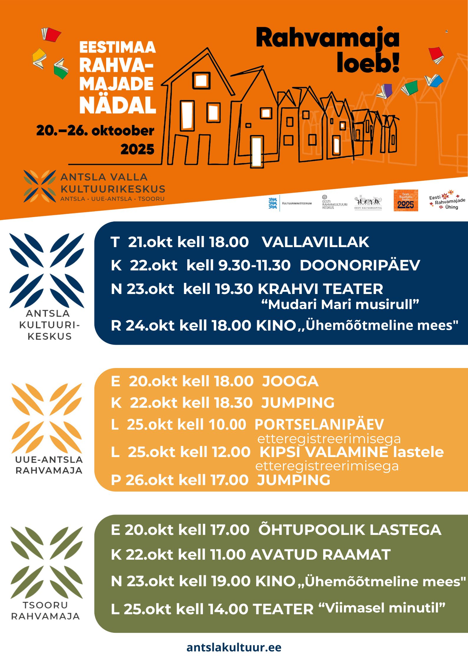 Antsla Kultuurikeskus Kooli tee 19, Antsla, Võrumaa, Eesti20.–26. oktoobril toimub neljandat korda üle-eestiline Eestimaa rahvamajade nädal, mis toob esile meie rahvamajade olulisuse ja nende mitmekülgse rolli kogukonnas. 🏛📚Seekord kannab nädal tähendusrikast teemat "Rahvamaja loeb!", mis on pühendatud Eesti raamatu aastale, kuid viitab ka laiemalt rahvamajade tähtsusele kogukondades📖🏛