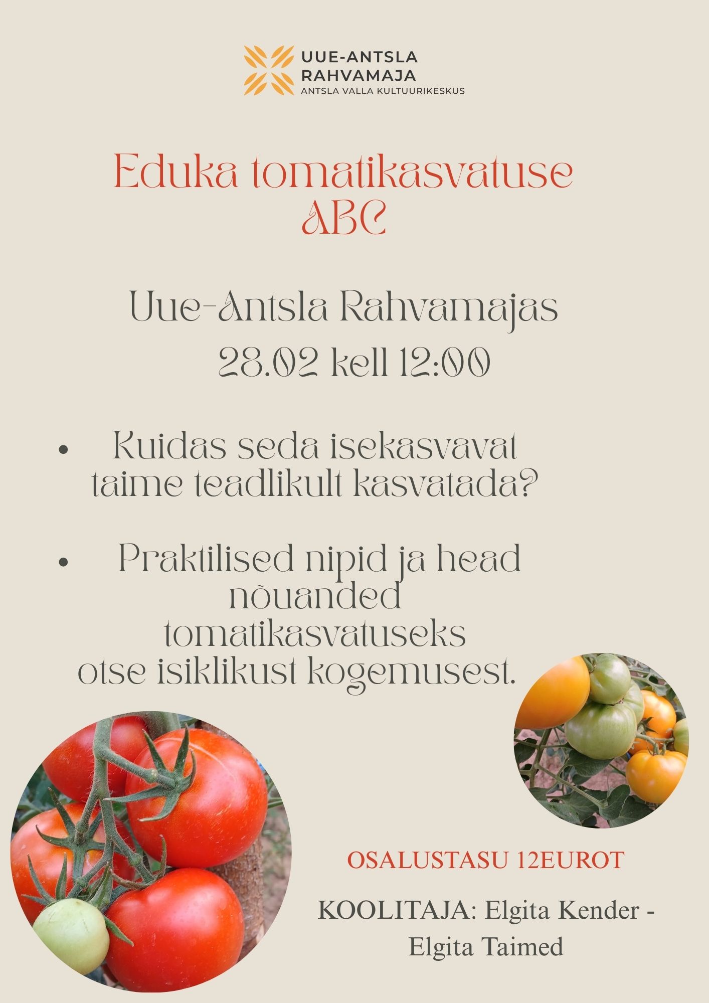 Kuupäev: 28.02 Koht: Uue-Antsla Rahvamaja Kellaaeg: 12:00 Osalustasu: 12 € / inimene Koolitus: Eduka tomatikasvatuse ABC 🍅 Tahad kasvatada tomateid, mis on terved, saagirikkad ja maitsvad? Sellel koolitusel räägime, kuidas isekasvavat tomatitaime teadlikult ja õigesti kasvatada – millal, kuidas ja miks just nii. Jagame praktilisi nippe ja häid nõuandeid otse kogemusest, et ka sinu tomatikasvatus oleks edukas, mitte katse-eksituse meetodil. Sobib nii algajale kui ka neile, kes tahavad oma teadmisi täiendada. Tule ja saa kindlus, et suvised tomatid rõõmustavad nii silma kui ka maitsemeelt! 🌱