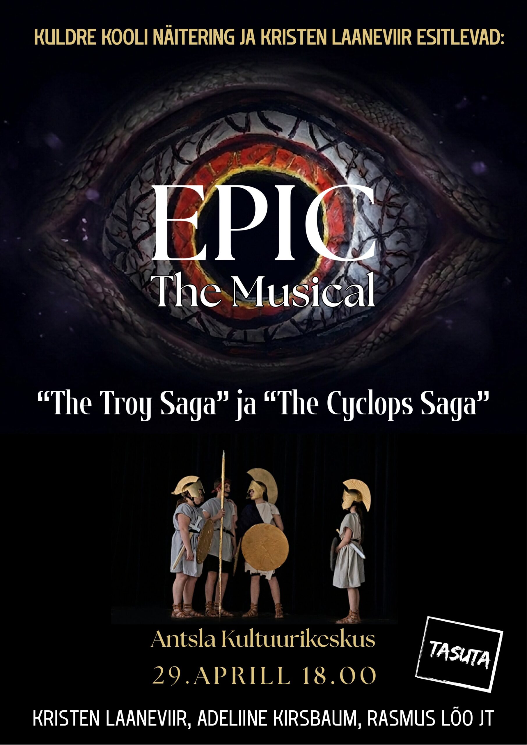 Antsla Kultuurikeskus Kooli tee 19, Antsla, Võrumaa, EestiTASUTA Kuldre Kooli 7. klassi õpilase Kristen Laaneviiri loovtöö raames valminud etendus nimega ,,Epic: The Musical", mis on Jorge Rivera-Herransi loodud muusikaline mugandus Homerose eeposest "Odüsseia". See on kontseptuaalne albumite sari, mis järgib Odysseuse kümneaastast rännakut koju Ithakasse pärast Trooja sõda, keskendudes tema kohtumistele mütoloogiliste olenditega ja tema sisemisele võitlusele selle vahel, kas jääda halastavaks meheks või muutuda "koletiseks", et ellu jääda. ,,Epic: The Musical on tehtud 9 erinevaks osaks, Kristeni loovtöös nägime me kahte esimest osa - ,,The Troy Saga’’ ja ,,The Cyclops Saga’’. Muusikalise etenduse aitasid Kristenil lavale tuua sõbrad näiteringist ja juhendaja Agnes Kirsbaum.