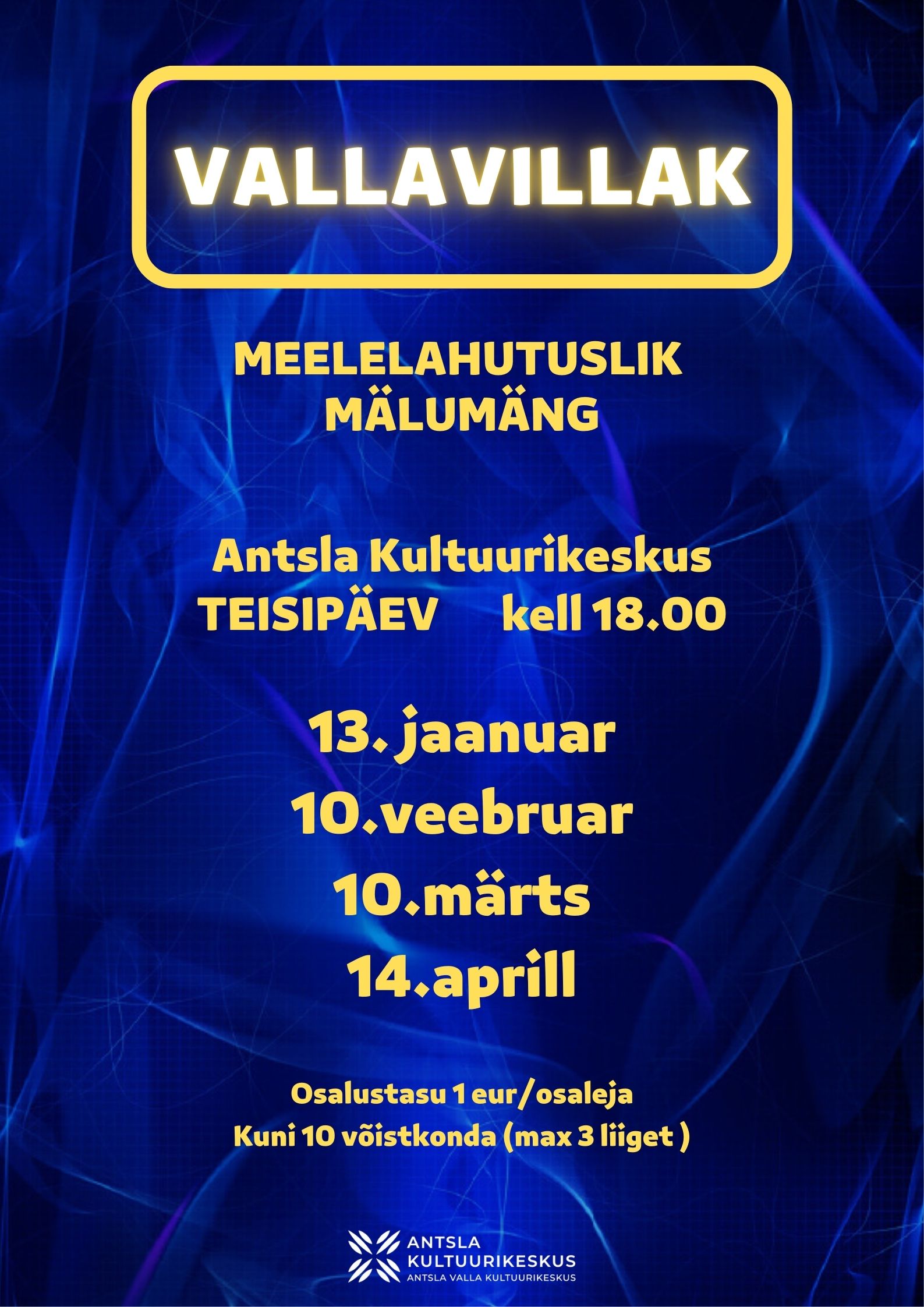 Antsla Kultuurikeskus Kooli tee 19, Antsla, Võrumaa, EestiMeelelahutuslik mälumäng, kus saab teadmisi proovile panna erinevatel teemadel Osalustasu 1 eur/osaleja Kuni 10 võistkonda (max 3 liiget )