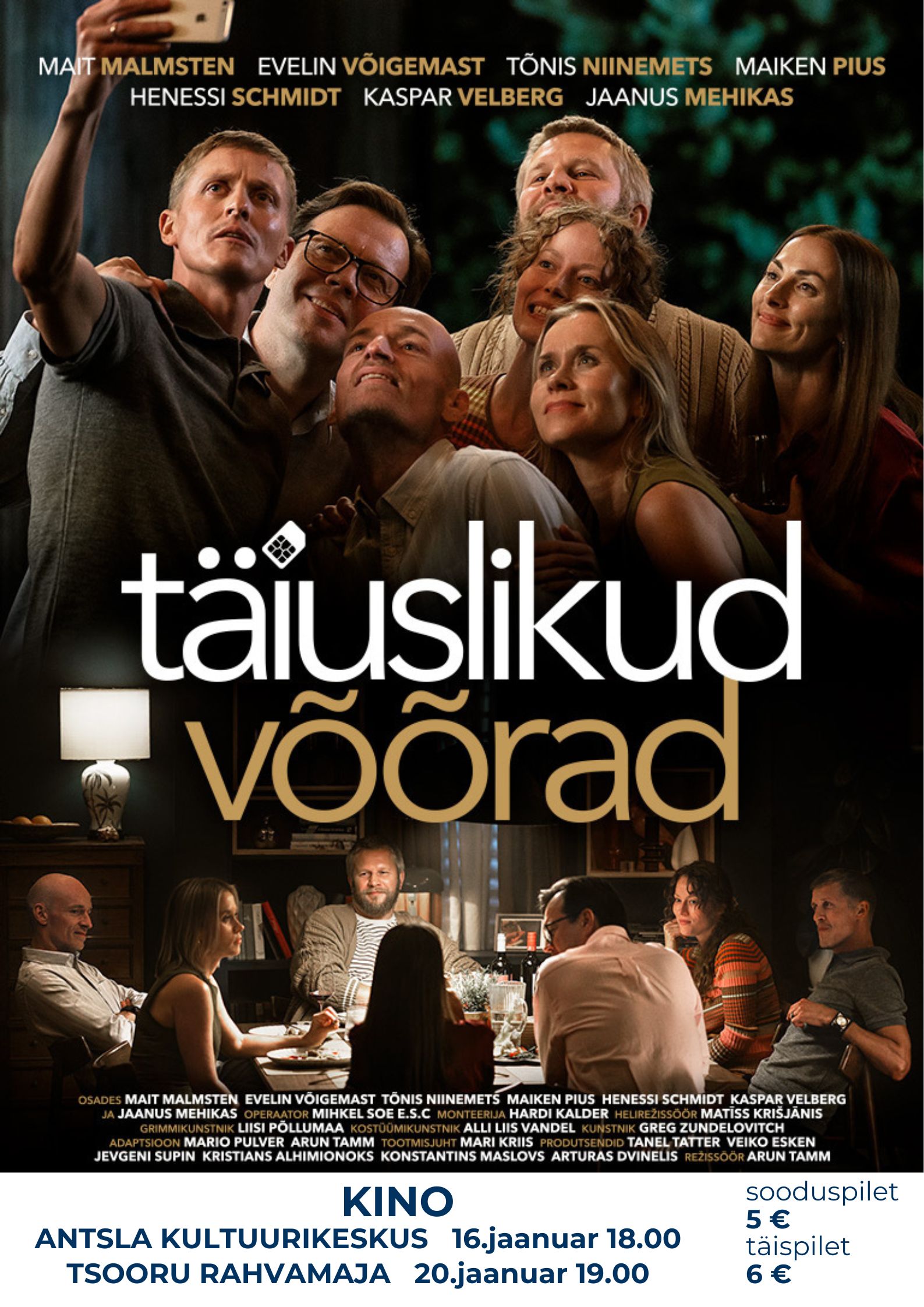 Antsla Kultuurikeskus Kooli tee 19, Antsla, Võrumaa, EestiTäispilet 6 eur Sooduspilet 5 eur Linateose tegevus käivitub täieliku kuuvarjutuse ööl, mil seitse lähedast sõpra kogunevad ühisele õhtusöögile. Üks osalejatest väidab, et suur osa suhteid puruneks, kui partnerid näeksid üksteise telefonikõnesid ja -sõnumeid. Vaidlus viib mänguni: kõik panevad oma telefonid lauale ning lubavad jagada saabuvad sõnumid ja kõned kõigiga. Pealtnäha süütu mäng muutub kiiresti pingeliseks – iga uus sõnum paljastab varjatud saladusi, afääre ja topeltelu, mis muudab õhtu lõpuks kõik suhted tundmatuseni. Filmis astuvad üles: Mait Malmsten, Evelin Võigemast, Tõnis Niinemets, Maiken Pius, Henessi Schmidt, Kaspar Velberg ja Jaanus Mehikas. Filmi režissöör on Arun Tamm, operaator Mihkel Soe, kunstnik…