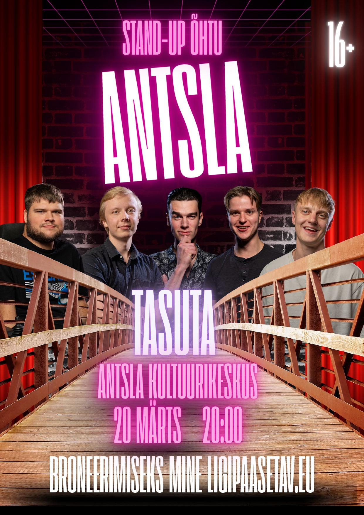 Antsla Kultuurikeskus Kooli tee 19, Antsla, Võrumaa, EestiTule tasuta stand-up komöödiat nautima! Antsla Kultuurikeskuses toimub 20.märts Euroopa Liidu poolt kaasrahastatud projekti “Ligipääsetav stand-up” raames tasuta stand-up õhtu, mille eesmärk on viia kaasaegne huumor ka nendeni, kes tavaliselt suurtesse keskustesse kultuuri nautima ei satu. Oodata on ainulaadset ja meeldejäävat õhtut! Broneeri koht https://ligipaasetav.eu/