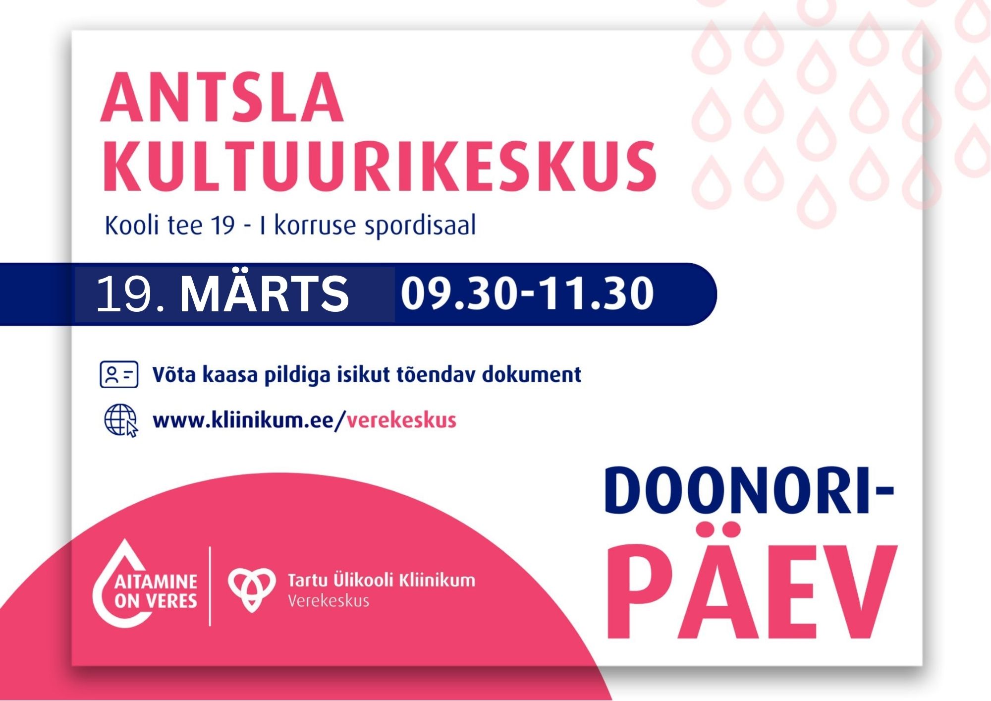 Antsla Kultuurikeskus Kooli tee 19, Antsla, Võrumaa, EestiKui Sul on hea tervis ja soov aidata abivajajat, siis tule verd loovutama. Kaasa pildiga isikut tõendav dokument! Korraldaja: Tartu Ülikooli Kliinikumi verekeskus Tartu, L. Puusepa 8, tel 731 9362 www.kliinikum.ee/verekeskus