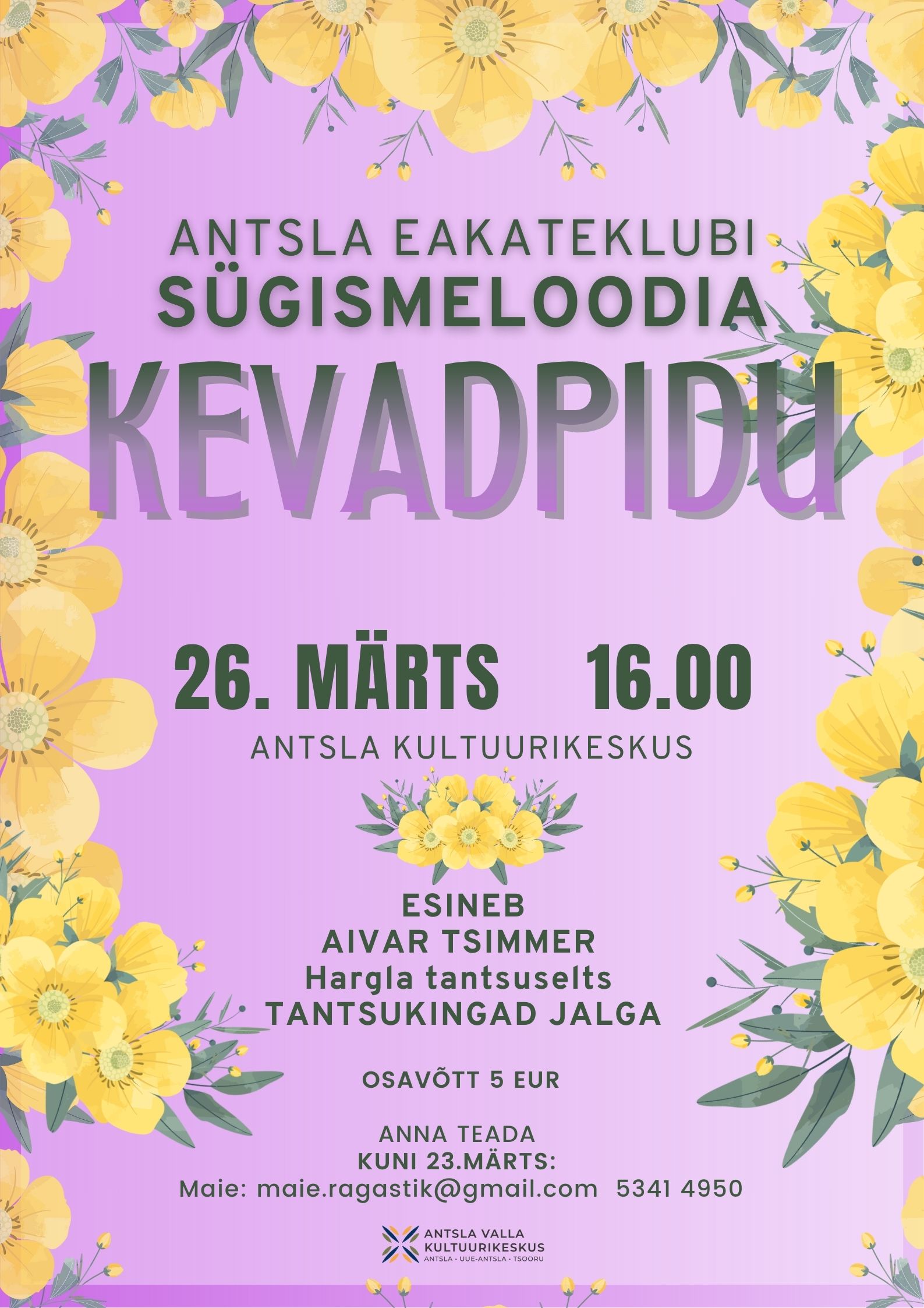Antsla Kultuurikeskus Kooli tee 19, Antsla, Võrumaa, Eestiosavõtt 5 eur OSALEMISEST ANNA TEADA kuni 23.märts: Maie: maie.ragastik@gmail.com 5341 4950